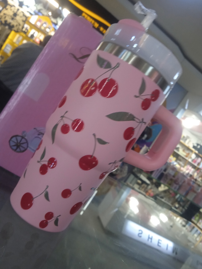 - "The scene depicts a light pink insulated tumbler, approximately 20-25 cm in height, adorned with an all-over pattern of red cherries with green stems and leaves" by FM-zlWXg1, licensed under CC BY 4.0