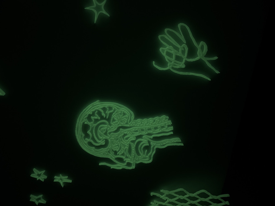 Glowing green line art on a dark background depicts various objects. A human skull dominates the center, filled with intricate internal details. Above it, a hand manipulates a tangled thread. Scattered around are stars and a grid pattern, possibly representing a net or woven material. The overall effect is mysterious and surreal, suggesting a dreamlike or otherworldly scene.