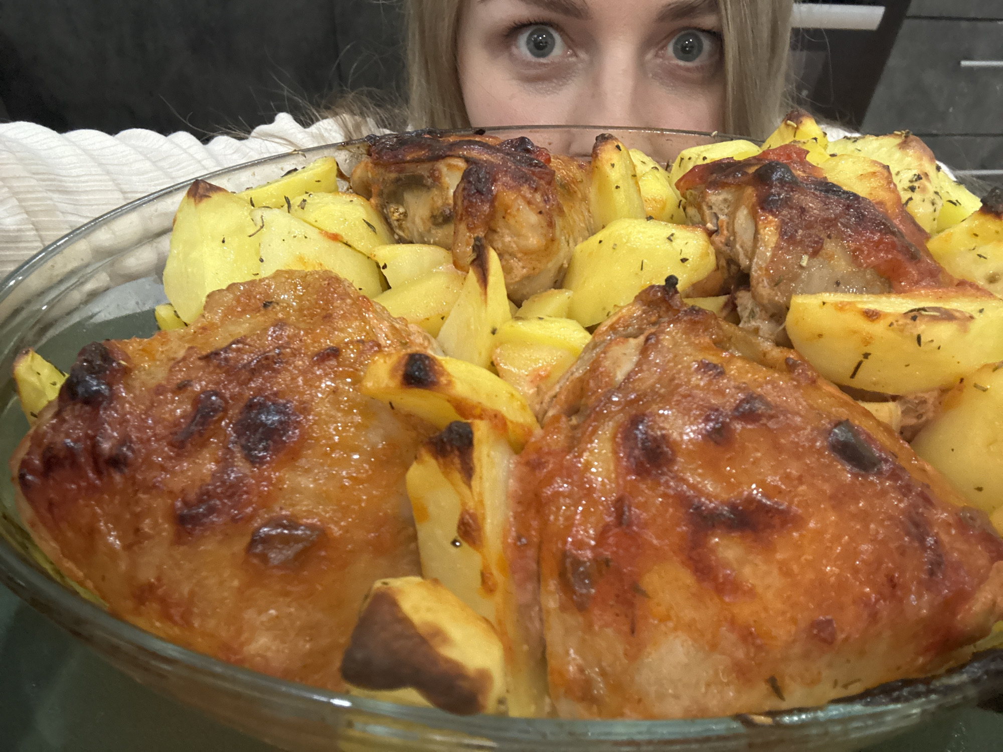 A woman with blonde hair and wide eyes peers over a glass baking dish filled with roasted chicken and potatoes. The chicken pieces appear golden brown and crispy, while the potatoes are cut into wedges and seasoned with herbs. The background is slightly blurred, but suggests an indoor setting. The specific location in Chaikovsky, Russia is not evident from the image.