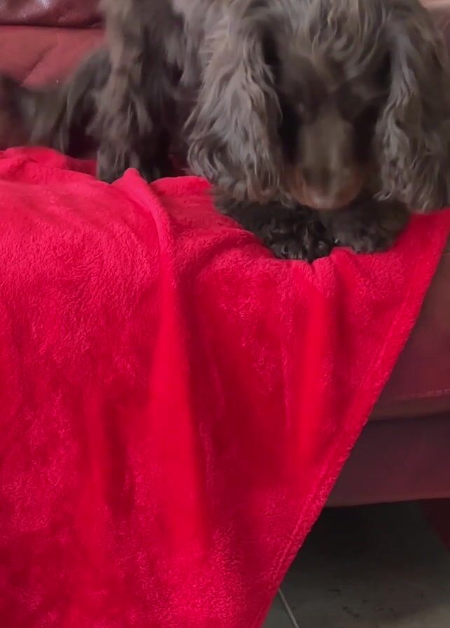 A medium shot depicts a brown Cocker Spaniel dog. Initially, it is lying on a red couch. The dog then jumps down and turns towards the camera, revealing its tail as it wags. The setting appears to be indoors, on a tiled floor.