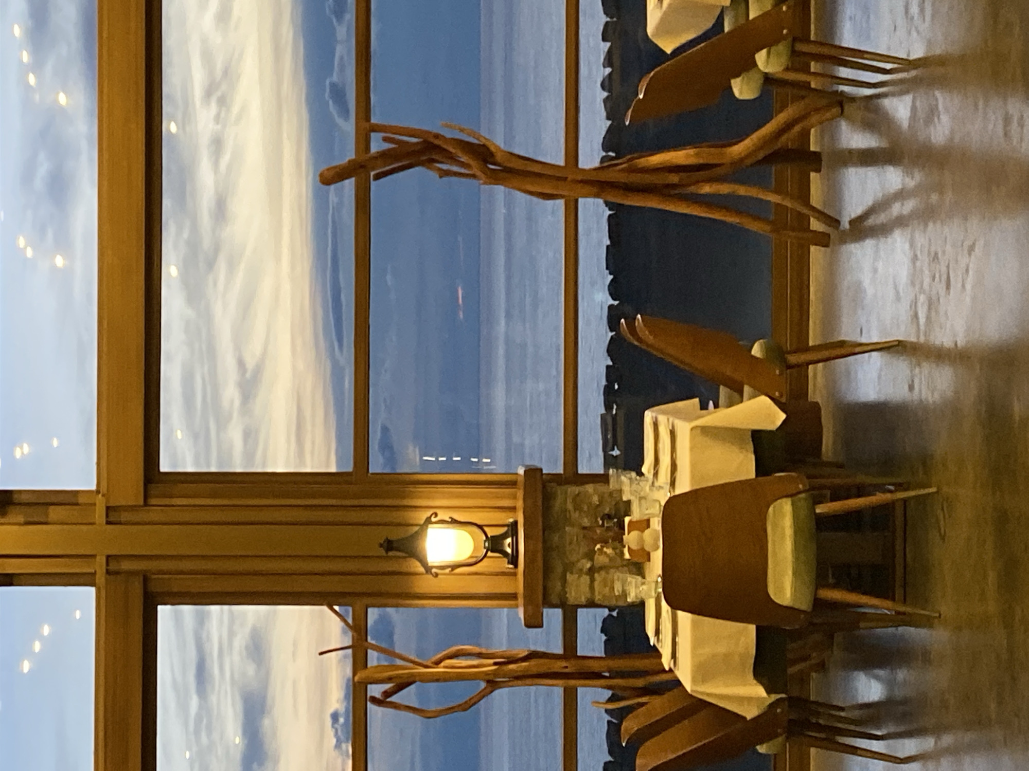 An interior scene shows a dining area with wooden tables and chairs. A large window reveals an expansive view of what appears to be the sea or a large lake, possibly in Kovačko Polje, Montenegro, if the location information is accurate. The sky is visible, with light clouds. A wooden decorative element is placed on each side of the window. A wall lamp is mounted to the structure between the windows. Each table is set with a white tablecloth and various dishware. The image is rotated sideways.