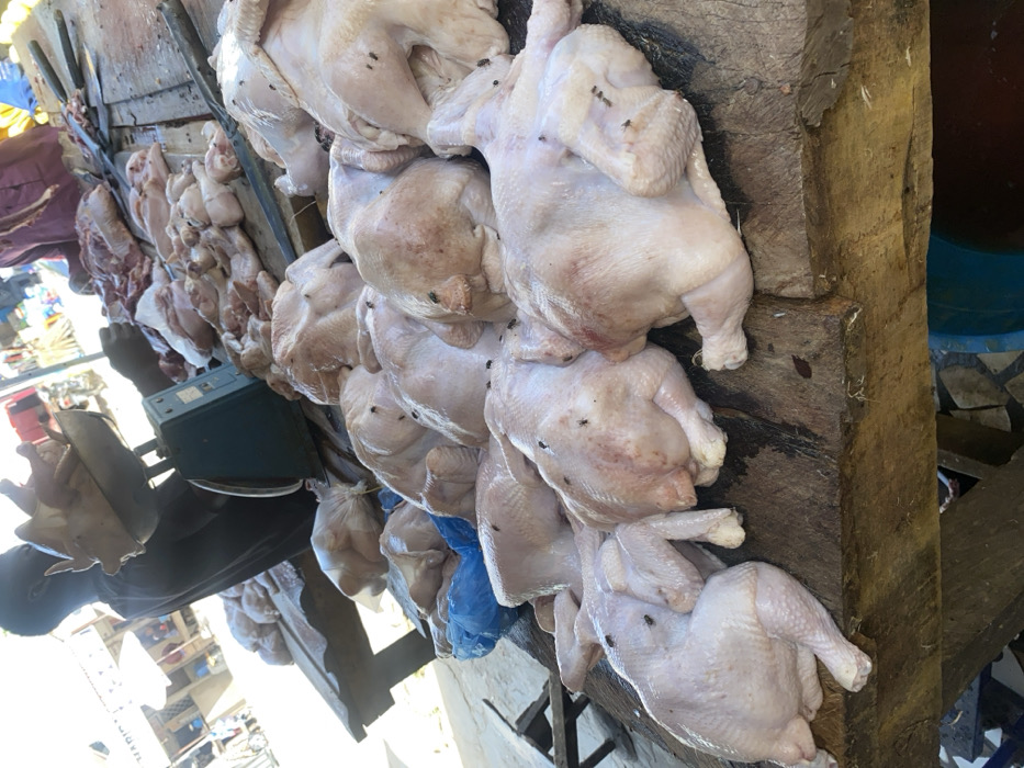 An outdoor market scene in Tarauni, Nigeria, displays multiple raw, plucked chicken carcasses on a worn wooden table