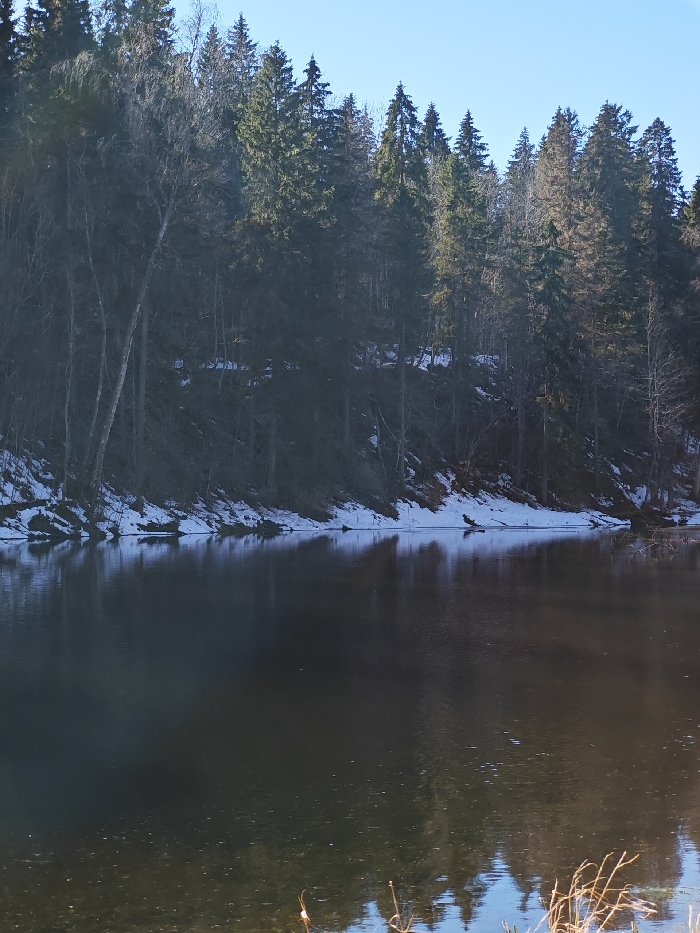 - "The image displays a natural landscape in Lopukhinka, Russia, characterized by a still body of water, a snow-covered bank, and a dense forest under a clear sky" by FM-YnLiU2, licensed under CC BY 4.0