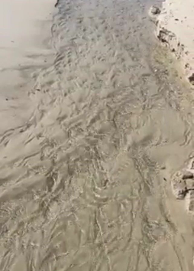 The video begins with a close-up shot of a sandy area on a beach, where water has carved multiple small channels