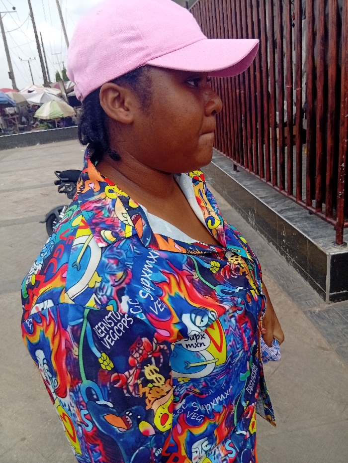 An adult female subject, dark-skinned, is captured in a profile medium shot, facing right, standing outdoors in Ura Nta Umuarandu, Nigeria. She wears a light pink baseball cap and a multi-colored short-sleeved collared shirt featuring a dense graphic pattern of flames, cartoon-like characters, text fragments (e.g., "VEGCPPS," "supx mxn"), and symbols on a dark blue background. A white undergarment is visible beneath the patterned shirt. Her visible hair is dark and appears to be short dreadlocks or braids. Her right hand holds a small, crumpled blue and white patterned cloth. The immediate ground is paved in a light gray material. In the background to the left, a portion of a black motorcycle is visible behind the subject, followed by several market stalls covered by light-colored canopies or umbrellas, with overhead utility poles and numerous power lines. To the right, a dark brown vertical slatted fence or gate stands on a dark gray concrete base. The sky is bright and overcast.