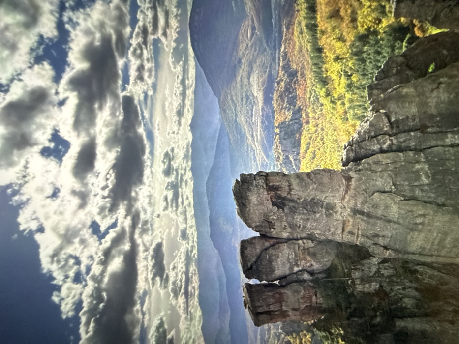 The scene is located in Cherven Bryag, Bulgaria. The image depicts a panoramic natural landscape centered on distinctive rock formations. In the mid-left, three prominent, vertically elongated rock pillars stand against a backdrop of mountainous terrain. The leftmost pillar appears reddish-brown, while the central and rightmost pillars are greyish-brown with visible reddish streaks and erosion patterns. Below and to the right of these main pillars, additional greyish-brown rock formations are present, including an arch-like opening in the lower right foreground. The ground surrounding the rock formations in the mid-distance is covered by a dense forest displaying vibrant autumnal colors, primarily bright yellow and orange foliage, interspersed with darker green coniferous trees. In the far background, multiple layers of distant mountain ranges are visible, characterized by a hazy bluish-grey tone that recedes into the horizon. The sky overhead features a dynamic array of white and dark grey cumulus clouds, with patches of blue sky visible, indicating a partly cloudy day. No people, animals, or man-made objects are identifiable within the frame.