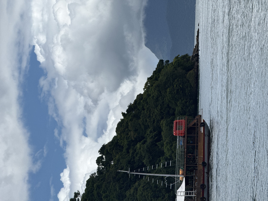 The image captures a coastal scene in Mangaratiba, Brazil. A wooden, multi-deck boat is positioned in the left midground, partially cropped on the left edge. The boat features a brown lower hull, a white upper hull, and a red stripe at the waterline, with black fenders along its side. A tall mast with ladder-like rungs and a decorative white railing shaped like a heart is visible on the upper deck. An orange-red rectangular container, consistent with a life raft or equipment storage, is present on the upper deck. No individuals are clearly discernible on the vessel. To the right and behind the boat, a densely vegetated, dark green hillside or island shoreline extends into the water. The vegetation consists of numerous tropical trees. The water's edge along the landmass shows exposed rocks. The foreground consists of rippling, grey-blue water. In the background, distant blue-grey mountains are visible on the right, partially obscured by a layer of white and grey clouds. The sky above displays a mix of clear blue patches and scattered white cumulus clouds, with heavier cloud formations present over the distant mountains. The overall illumination suggests overcast or partly cloudy conditions.