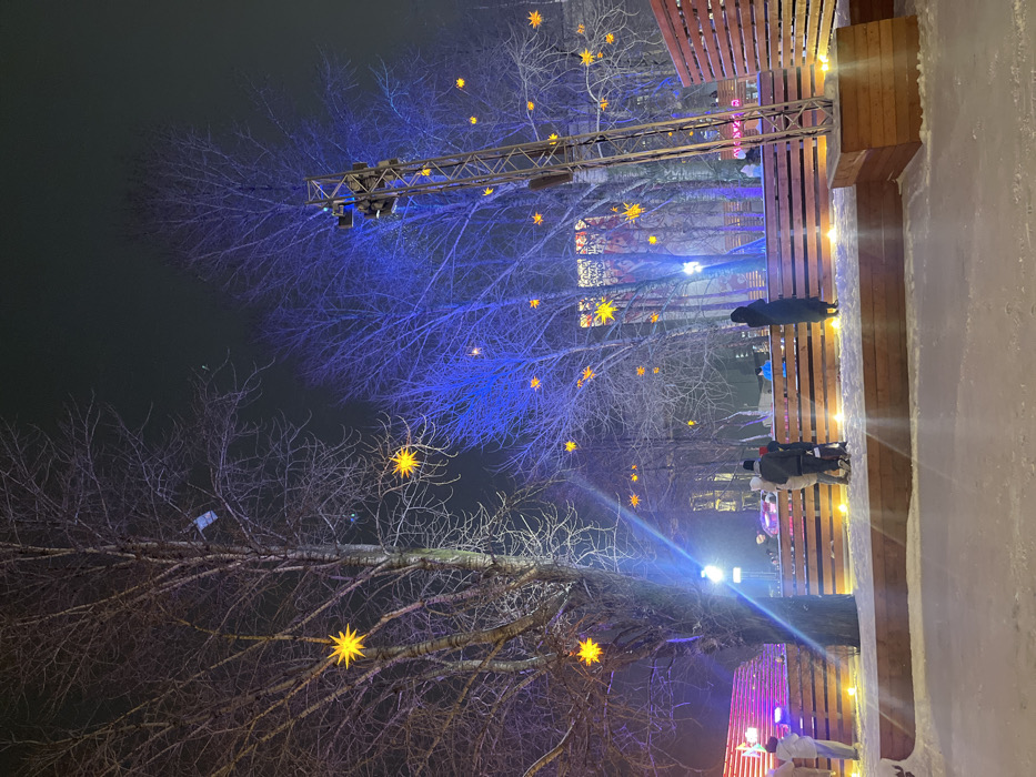 Night scene with bare trees adorned with illuminated star decorations. Blue spotlights highlight the branches. A metal truss structure stands above, supporting lights. People stroll along a wooden boardwalk, illuminated by warm vertical lights. The ground is covered in snow. Overall, a festive, wintry atmosphere.