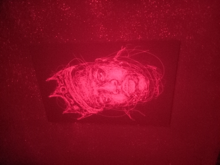 A red-toned image features a drawing of a face on what appears to be a dark surface. The face is outlined with scribbled, chaotic lines, giving it an abstract and somewhat unsettling appearance. The red light dominates the scene, casting a uniform glow and obscuring the details of the surrounding environment, which looks textured. The drawing is the central focus.