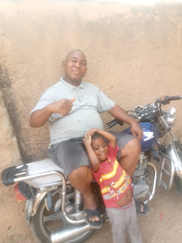 In Pantame, Nigeria, an adult male and a child are positioned in front of a light-brown, textured wall with visible horizontal abrasions. The male, with a bald head and dark complexion, wears a light grey polo shirt, dark grey shorts, and black sandals. He is seated on a blue Honda motorcycle with a light-colored seat and a chrome rear rack, positioned facing forward. His right arm is bent at the elbow, hand extended with a thumb raised in an upward gesture. He is smiling and looking towards the camera. A child, of dark complexion and wearing a red t-shirt with yellow and white striped patterns and light grey pants, stands directly in front of the man, between his legs. The child's hands are placed on top of their head, and they are smiling while looking towards the camera. The ground surface appears to be dirt or sand.