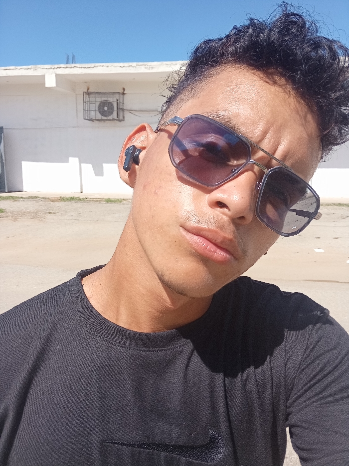 A young man poses for a selfie outdoors, wearing sunglasses and a black t-shirt with a subtle Nike logo. An earbud is visible in his left ear. The background shows a white, flat-roofed building with a vent and a bright blue sky. The man’s hair is dark and styled with texture. The lighting suggests a sunny day.