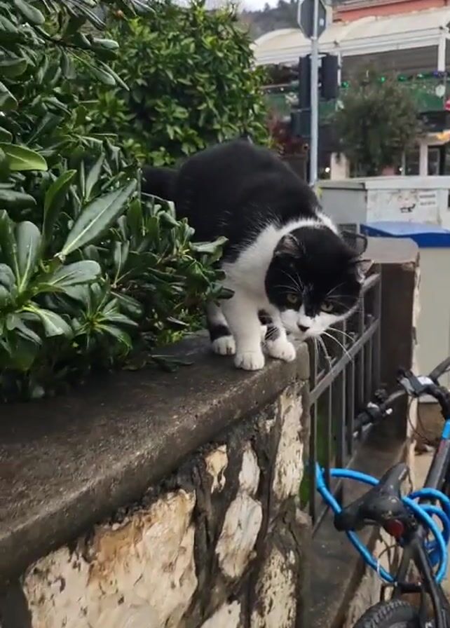 - "A black and white cat is walking along the top of a stone wall next to a bush" by FM-ngoIJ3, licensed under CC BY 4.0