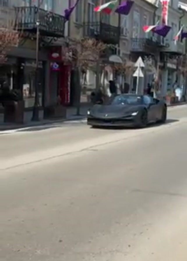 A matte gray Ferrari SF90 Spider drives slowly on a wide, sunny street lined with European buildings. Some people are seen walking on the sidewalks. The buildings have wrought iron balconies and are decorated with flags from Bulgaria and purple banners. The Ferrari has dark wheels and a visible driver and passenger.