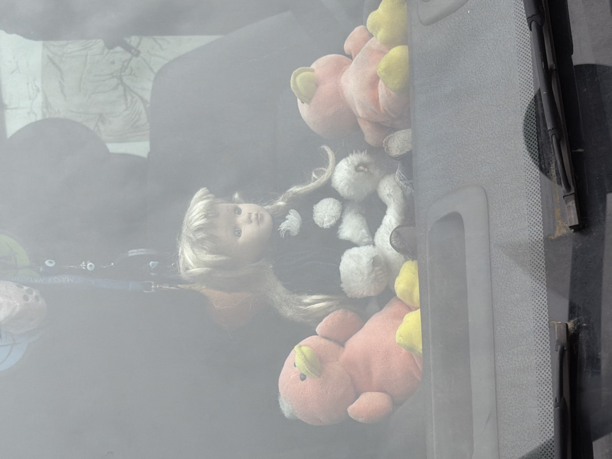 The image, taken through a dusty or foggy window, features a collection of children's toys, including two plush toys of similar design, predominantly pink with yellow accents, and a doll with long, blonde hair wearing a black outfit with white pom-poms, inside a vehicle