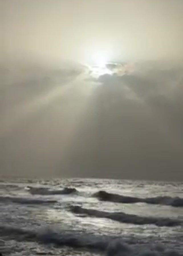 n ocean scene under a cloudy sky. The sun is visible through the clouds, casting rays of light downwards. The water is choppy with small waves rolling towards the shore. The overall tone is muted due to the heavy cloud cover. There are some dark rocks in the extreme foreground. The video is shot from a static position with no camera movement.