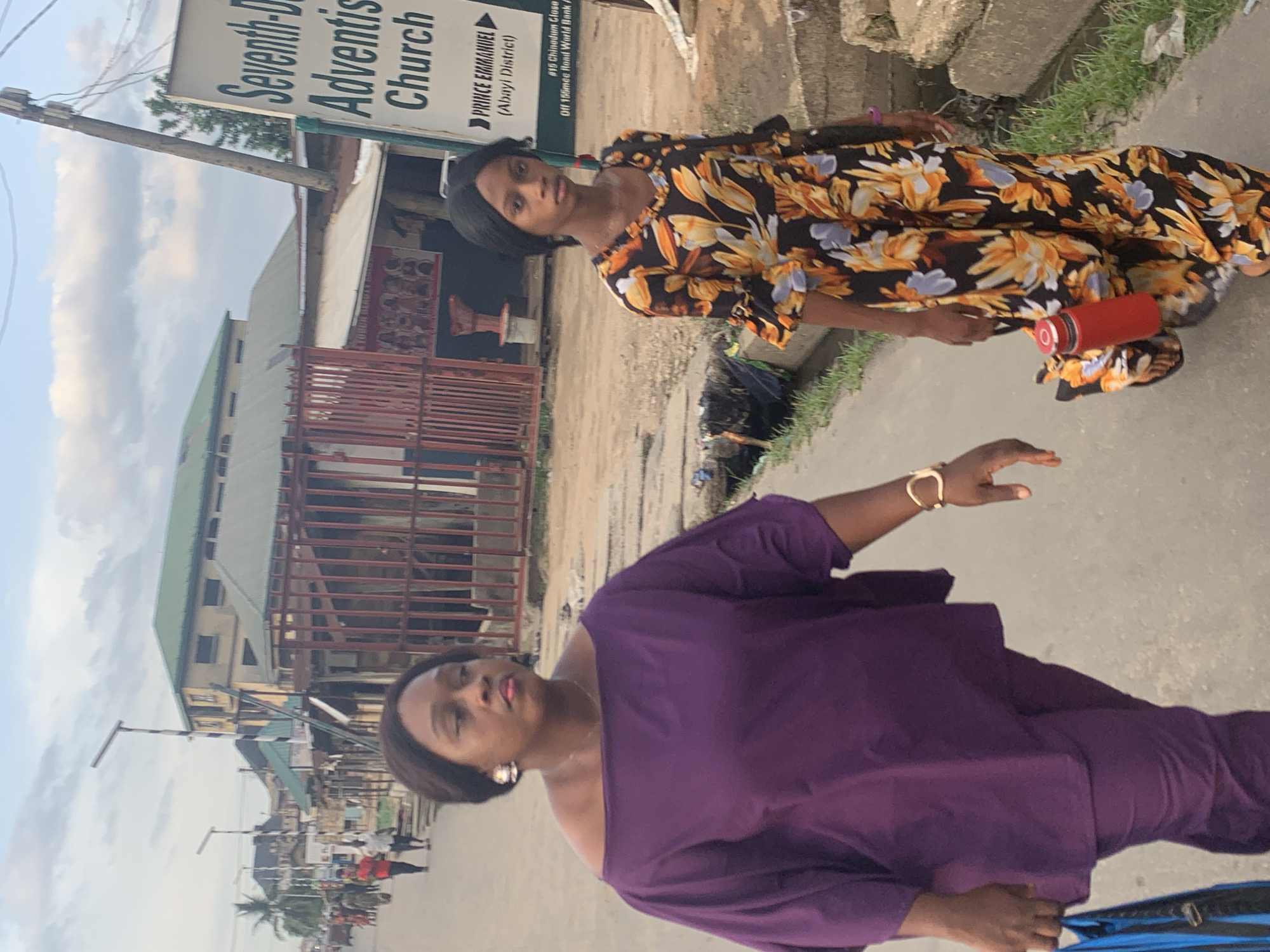Two women are standing on a street in Umuode, Nigeria. One woman is wearing a purple outfit, while the other is wearing a floral dress with a red water bottle. A sign for the Seventh-day Adventist Church and a building with a rust-colored wrought iron fence are visible in the background. Street vendors and pedestrians are active in the background.