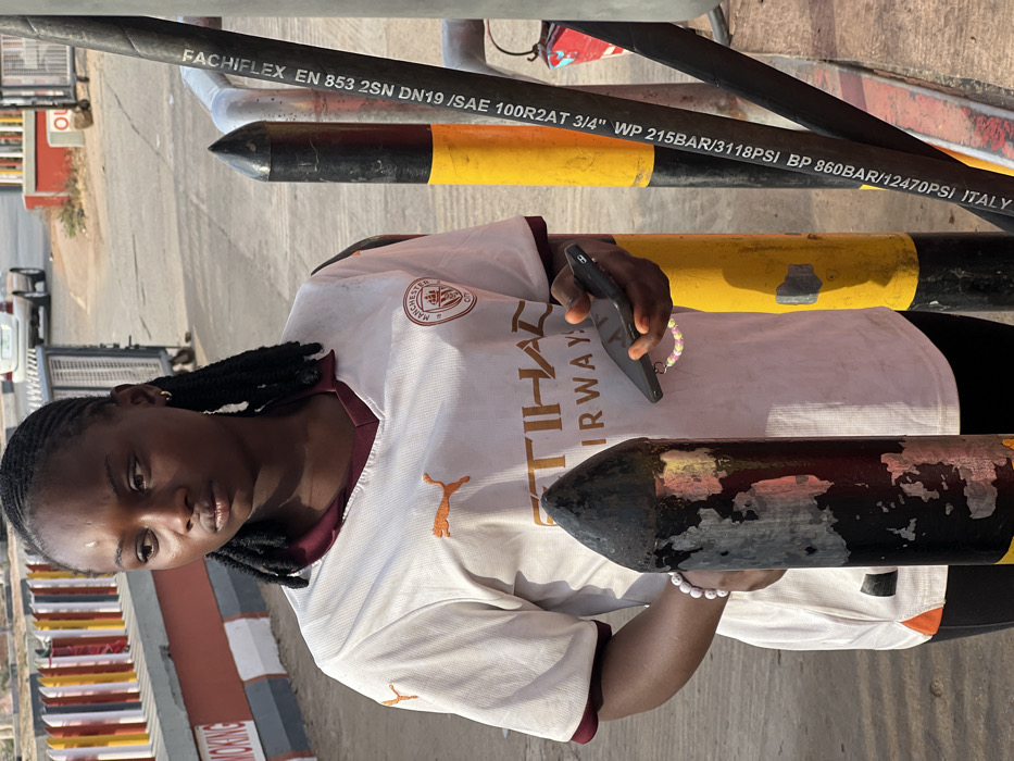 A woman in a Manchester City soccer jersey holds a phone. The jersey features "ETIHAD AIRWAYS" and the Puma logo. Behind her are black and yellow safety barriers and a black hose labeled "FACHIFLEX EN 853 2SN DN19 /SAE 100R2AT 3/4" WP 215BAR/3118PSI BP 860BAR/12470PSI ITALY." She wears a white bracelet on her right wrist and a colorful beaded accessory dangles from the phone. The setting appears to be an industrial or outdoor location.