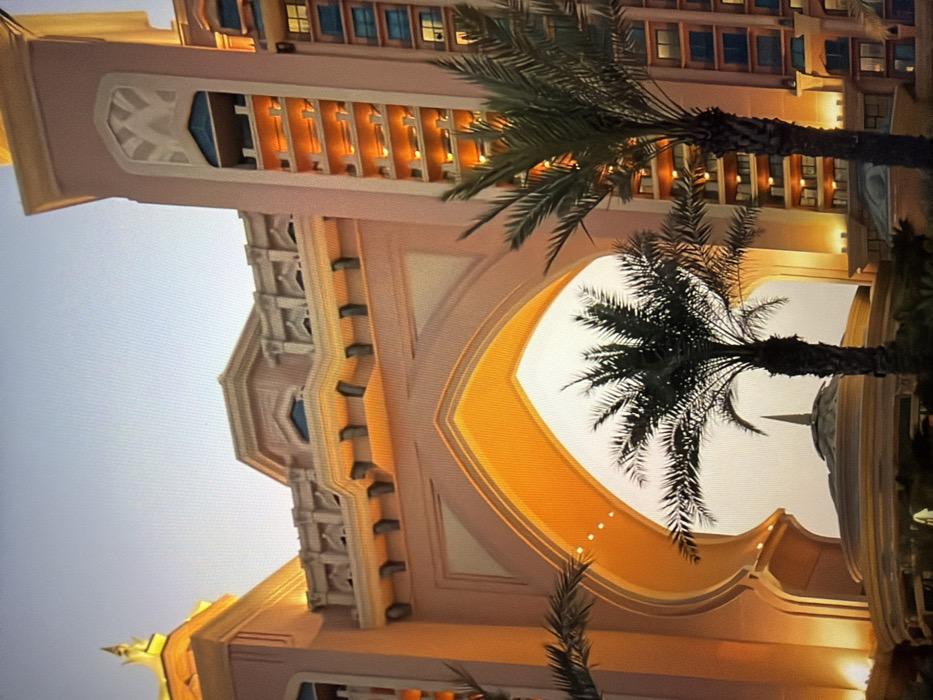 This image depicts a large, ornate building, located in the city of Burgas, Bulgaria. The structure features a dominant light peach or pink color palette, accented by warm golden illumination highlighting its architectural details. A prominent, large pointed archway, indicative of Moorish or Islamic architectural influence, forms a central visual element, through which a distant domed structure topped with a spire is visible. The archway's interior is brightly lit with a golden hue. The building's upper sections include intricate decorative cornices, patterns, and pointed finials on rooftops. To the right, a multi-story section of the building shows numerous balconies with internal lights glowing. Several mature palm trees, with dark green fronds and textured trunks, stand in the foreground and midground, partially obscuring the building. The sky above is clear and light, suggesting either dawn or dusk. No individuals are present, nor are any actions or interactions depicted.