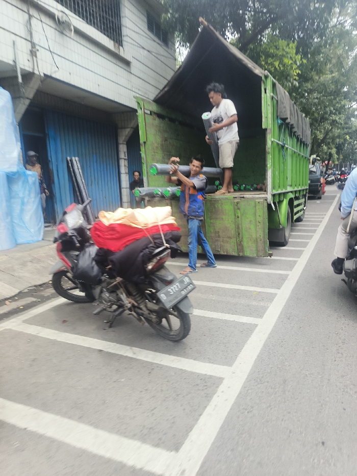 A green truck is parked on a street with painted parking spaces. Two men are unloading long, cylindrical objects from the truck bed. One man is standing on the truck and passing the objects to the other, who is standing on the street. A motorcycle is parked nearby, heavily loaded with red and black fabric. A building with blue shutters is in the background. Other vehicles are visible on the street.