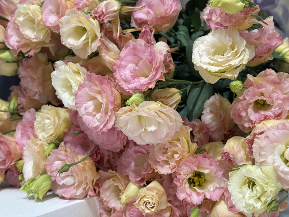 A close-up, high-angle view captures a dense arrangement of Lisianthus flowers. The predominant colors are soft pink, cream, and pale yellow, often exhibiting subtle gradients within individual petals. Flowers are visible in various stages of bloom, including fully open blossoms with ruffled edges, partially unfurled flowers, and tight green buds. Green stems and scattered dark green leaves are interspersed among the floral heads. A section of a white, non-descript object or wrapping material is visible along the far left edge of the frame. The background is out of focus and dark, providing no discernible details. No individuals, actions, or interactions are present. The scene is located in the city of Yerevan, Armenia.