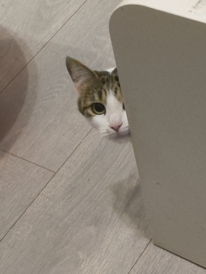 An indoor scene in Sofia, Bulgaria, displays a domestic cat partially visible. The cat has a white face with brown and grey tabby markings around its visible ear and the side of its head. Its right eye, which has a light green or yellowish iris, and a pink nose are clearly visible. The cat's head is positioned to the left of a large, opaque, off-white object, which obscures the majority of its body. This object possesses a smooth surface and a rounded vertical edge. The cat rests on a floor composed of light beige or grey planks with visible seams, consistent with laminate or wood-look tile. Ambient lighting illuminates the scene.