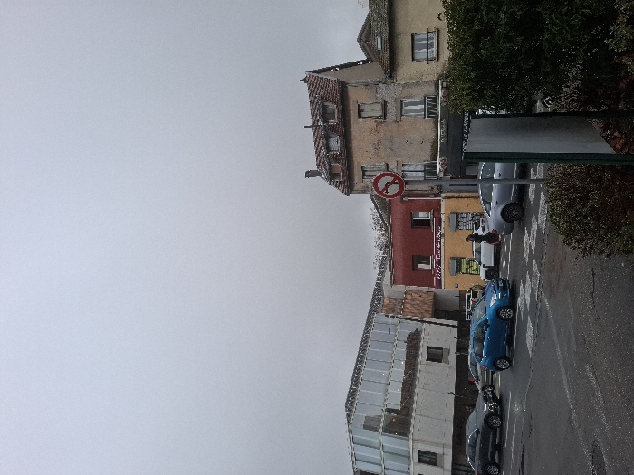 A street scene shows buildings of varying heights and colors. A red building with a no-left-turn sign above it stands next to a yellow building. Cars of different colors are parked along the street, including a blue one and several gray or black ones. The sky is overcast, and the road appears wet.