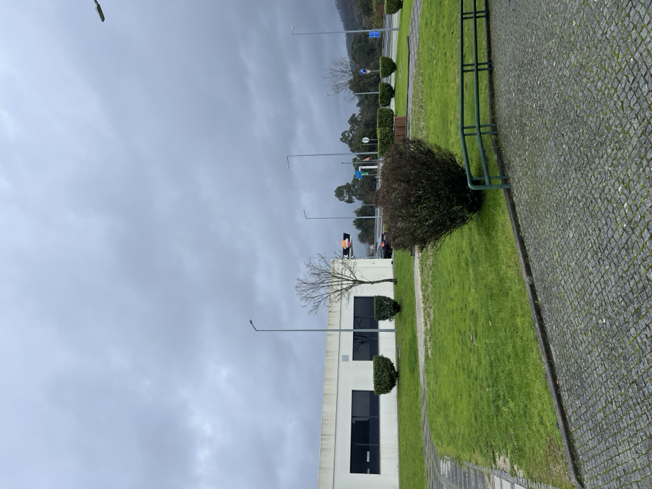The image depicts an exterior scene in Penafiel, Portugal, under a uniformly overcast, grey sky. In the immediate foreground, a dark green metal railing partially borders a textured cobblestone-like pavement on the lower right. Adjacent to this is a well-maintained green lawn, which features a prominent, dense, rounded dark green bush in the center and a curving paved pathway. The midground is dominated by a low, single-story building with a light-colored facade and multiple dark-paned rectangular windows on the left. Two trimmed, spherical green bushes are positioned in front of the building. To the right of the building, a bare-branched deciduous tree stands. Beyond these elements, a multi-lane road or highway is visible, with a dark-colored vehicle partially observable. An illuminated amber traffic light hangs from a pole above the road. Numerous tall, slender streetlights are interspersed across the midground and extending into the background. Several blue and white informational road signs are present along the roadside. The background reveals a dense line of evergreen trees and distant hills or mountains, all silhouetted against the uniformly grey sky. No individuals or dynamic actions are discernable within the frame.