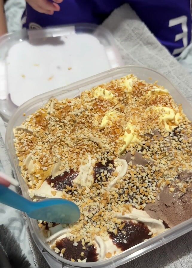 A partially open rectangular plastic container of ice cream is on a gray towel. The ice cream has several sections of different flavors. The top is covered with chopped nuts, dabs of light yellow frosting, and drizzles of dark chocolate syrup. A blue plastic spoon sits to the left of the container. A child is sitting in the background, wearing a purple shirt with white lettering. Their hand occasionally moves near the container. The hand of an adult, wearing white nail polish, appears briefly to adjust the spoon in the ice cream.