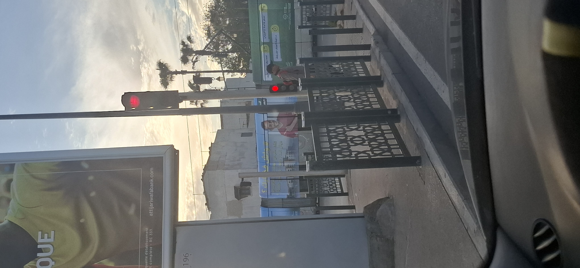The image depicts a street scene in Rabat, Morocco, viewed from inside a vehicle. The foreground shows a dark dashboard with a horizontal air vent on the left. The scene beyond the vehicle's windshield is observed at what appears to be late afternoon or early evening, characterized by a bright, hazy sky with scattered clouds and a warm, low sun. Dominating the left side is a large billboard, partially visible, displaying an advertisement with a person in a yellow garment and the text "attijariwafabank.com" clearly legible at the bottom. A tall, dark pole with two red traffic lights is centrally positioned, indicating a stop. To the right, a solitary individual walks on a paved sidewalk, positioned between the traffic light pole and a decorative metal fence. This person wears a light-colored jacket, a dark cap, and a red backpack. The fence, composed of multiple dark metal panels with intricate, geometric openwork patterns, separates the sidewalk from the street. Behind the pedestrian and the fence, a light-blue tram is visible, featuring a large advertisement on its side depicting a smiling man in a red shirt, accompanied by Arabic text. Further to the right and slightly behind, part of a green public transport vehicle, possibly another tram or bus, is seen also displaying Arabic advertisements. In the mid-ground, a plain, light-grey building with a flat roof and a small, dark rectangular window protrudes above the tram line. Several palm trees and other green foliage are visible in the background on the right. The paved street surface in the immediate foreground includes a concrete curb and faint white road markings.