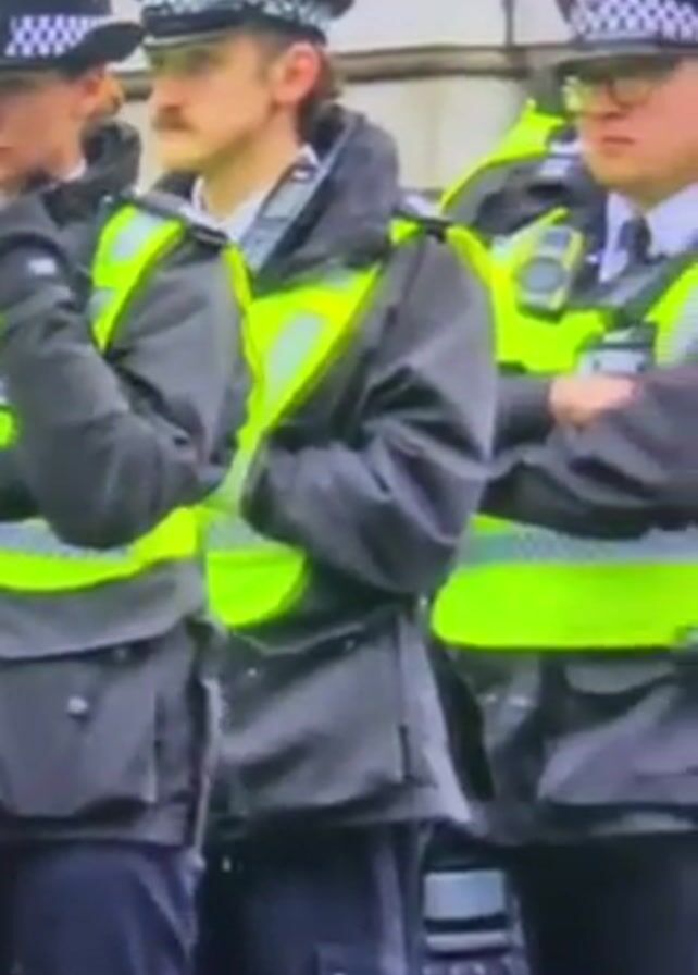 gathering of people, likely a protest or demonstration, being monitored by uniformed police officers
