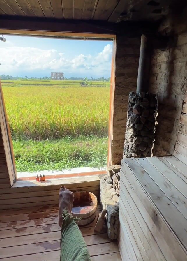 - "interior of a wooden sauna room with a large window providing a view of a green field" by FM-7Etsn1, licensed under CC BY 4.0