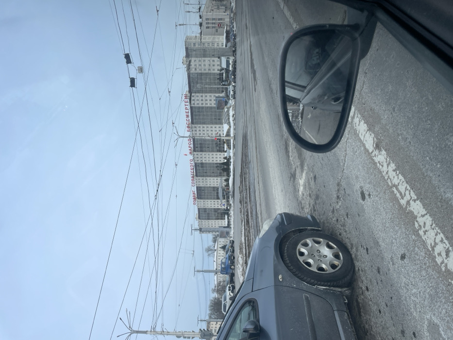 The image captures a street-level view from inside a vehicle at an intersection in Vitsebsk, Belarus, during overcast winter conditions. In the immediate foreground, to the left, is the front quarter of a parked or stopped dark grey hatchback vehicle, likely a Peugeot, showcasing its front wheel with a silver five-spoke hubcap. To the right, the vehicle's side mirror from which the photograph is taken reflects a partial view of its own dark body and faint white road markings on a slush-covered asphalt surface. The roadway itself is multi-lane, exhibiting a mix of slush, ice, and faded white lane markings, suggesting a recent or ongoing thaw of snow. A central median strip, covered with sparse brown vegetation and patches of dirty snow, separates the traffic flows. In the mid-ground and background, a large, multi-story white building with numerous regularly spaced windows dominates the skyline. This building is a residential block located on Victory Square (Ploshcha Peramohi) in Vitsebsk. Prominently displayed across its upper facade in red Cyrillic letters is the inscription "ПОДВИГ СОВЕТСКОГО НАРОД БЕССМЕРТЕН," which translates to "THE FEAT OF THE SOVIET PEOPLE IS IMMORTAL." Several other vehicles, including cars and a blue utility truck, are visible in the vicinity of the building and further down the street. Overhead power and trolleybus lines are extensively visible, crisscrossing the pale, featureless sky, supported by numerous utility poles. Streetlights are also discernible. No individuals are clearly identifiable in the scene.