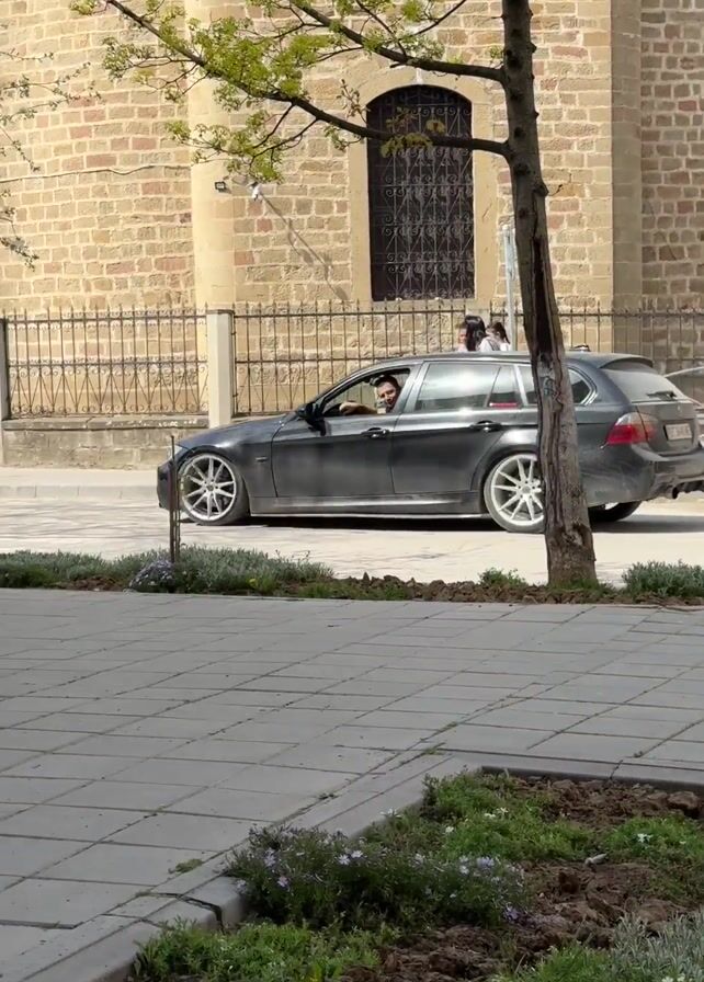 A black BMW station wagon is captured in a short video, seen from the street. The car, bearing Bulgarian license plate "BT 3640 ME," is parked on the roadside. A driver is visible behind the wheel. The scene is set in a village, indicated by traditional houses and a church with a stone wall along the sidewalk. The day appears sunny. Pedestrians walk by on the sidewalk. The video is shot from a stationary position, with the camera panning slightly to follow the car.