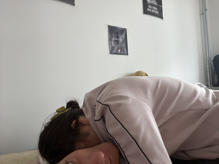 The image displays an indoor scene, consistent with a residential interior within an urban environment such as Sofia, Bulgaria, though no specific landmarks are visible to pinpoint an exact location. The primary subject is a person lying prone, face down, with their head turned to the left and partially obscured by their arm or shoulder. The individual has dark hair styled in a bun, secured with a yellow and green patterned scrunchie. They are dressed in light pink long-sleeved pajamas or loungewear featuring dark-colored piping along the seams of the sleeves. The background consists of a plain white wall. Three items are affixed to this wall: a dark, rectangular object partially visible in the upper left corner; a central poster depicting an abstract, possibly technical, design (resembling a racetrack circuit); and an upper right poster displaying the white text "NO RISK NO STORY." A yellow fabric item, possibly a pillow or blanket, is partially visible behind the subject's upper back. In the far right background, two vertical silver-colored pipes, likely utility conduits, are visible extending upwards along the wall, alongside a partial view of a black bag or object in the upper right corner. The person rests on a light-colored, possibly fluffy, surface. The overall scene conveys a state of rest or repose.