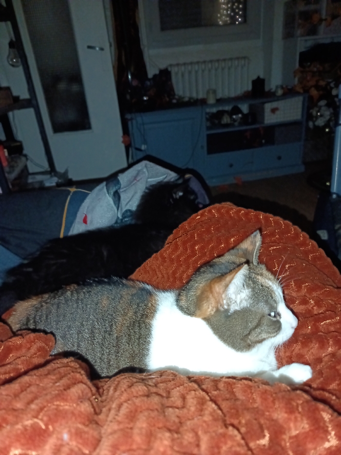 Two cats relax on an orange blanket. A calico cat with white, gray, and brown fur rests in the foreground. Behind it, a black cat blends with the surrounding blanket. The cats are indoors, with a blurred background showing a blue cabinet, a white radiator, and other furniture. The overall lighting is dim, contributing to a cozy atmosphere.