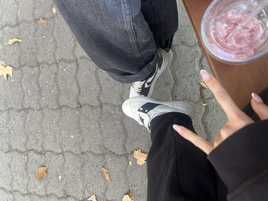 An elevated view captures the lower bodies of two individuals seated outdoors. The ground is paved with gray interlocking concrete pavers, scattered with dry brown and yellowish fallen leaves. The person on the left wears black trousers and a white low-top sneaker featuring a dark band across the laces and small studs along the sole. Their left hand, prominently positioned in the lower-left foreground, displays French-tipped fingernails and is posed in a "V" gesture with the index and middle fingers extended. The person on the right wears dark grey, wide-leg jeans and black-and-white sneakers with a distinct white graphic on the side. In the lower-right foreground, a clear plastic cup containing a pink beverage with ice and a straw rests on a brown wooden surface, likely a bench or table. The presence of fallen leaves suggests an autumn season. While a precise street address or specific landmark in Yerevan, Armenia, cannot be definitively identified from the visible details, the style of paving and urban foliage are consistent with numerous public pedestrian areas, parks, or outdoor cafes found throughout the city.