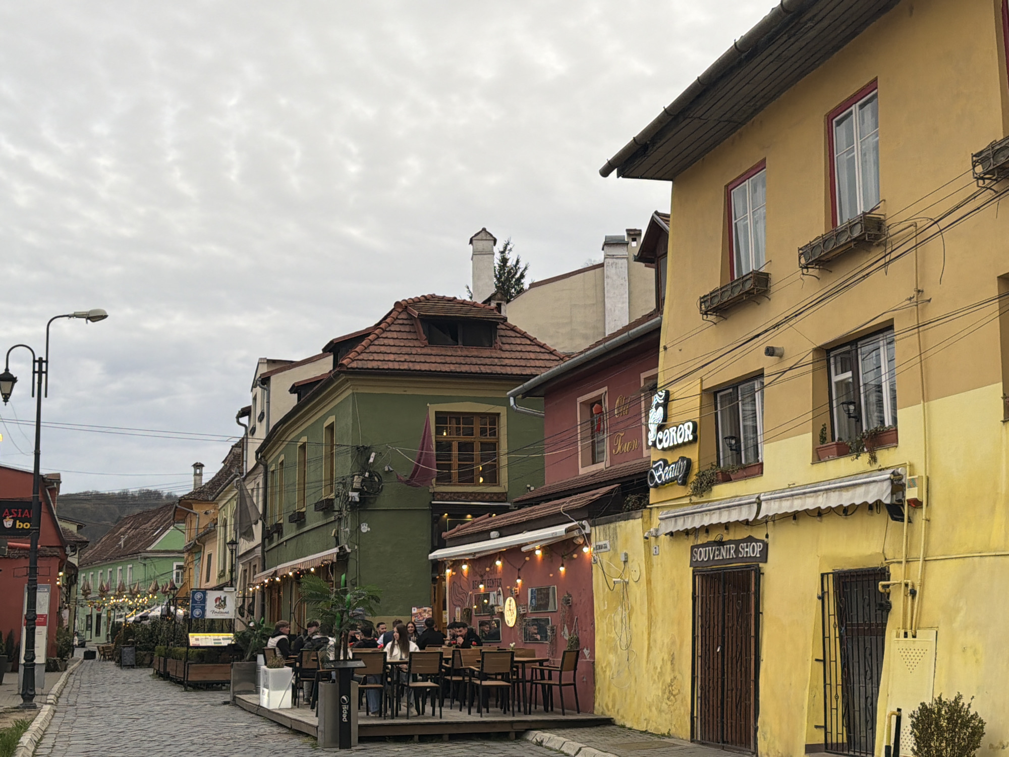 street scene in Sighișoara, Romania. The street is paved with cobblestones and lined with colorful buildings. Several people are seated at tables outside of a restaurant on a raised wooden platform. The building on the right is yellow with a souvenir shop on the ground floor. The sky is overcast. A street lamp is visible on the left of the image.