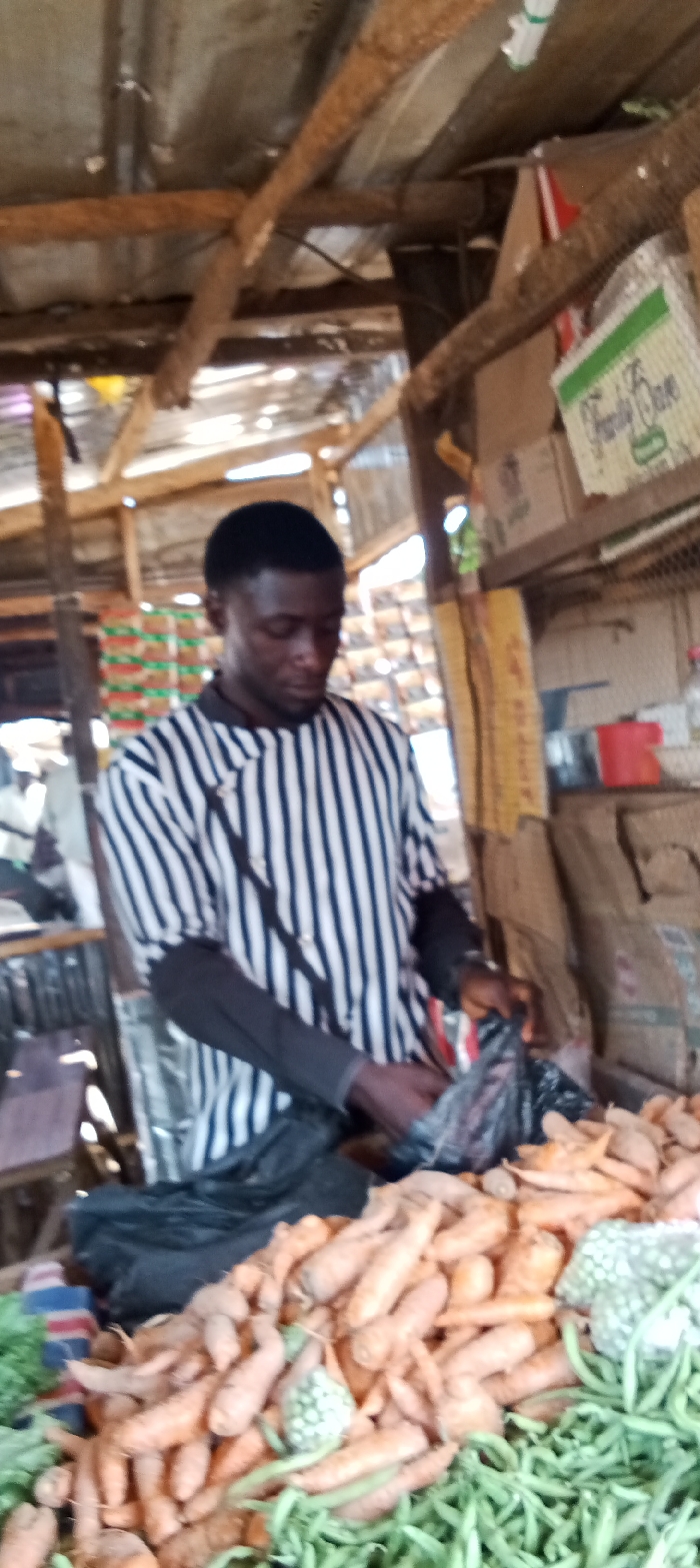 The image depicts a man at a market stall in Rido, Nigeria. The man, with short dark hair and a fade haircut, is wearing a striped short-sleeved shirt with black and white vertical stripes, and black long-sleeved undershirt visible beneath. A black strap, possibly from a bag, crosses his torso diagonally. He is positioned behind a display of produce, focusing his attention downwards on his hands, where he appears to be handling or bagging items into a black plastic bag. In the foreground, a large pile of orange carrots occupies the majority of the lower frame, with some green beans or similar green vegetables visible to the right and left of the carrot pile. Two small, light-green, spiky, spherical vegetables are interspersed among the carrots. The market stall environment features a rustic, wooden support structure with rough, unpainted timber beams visible overhead and vertically. A corrugated metal roof is partially visible above the wooden framework. Various boxes and containers are stacked or stored on shelves behind the man, including a box with "Formula One" text and a green logo. A red container and other miscellaneous items are also present on a shelf to the right. The lighting suggests an outdoor or semi-open setting, typical of a marketplace.