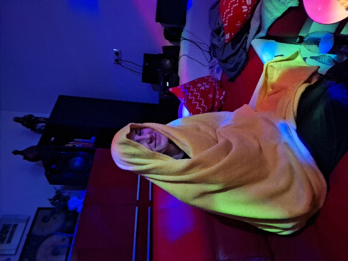 The scene depicts an indoor environment in Panagyurishte, Bulgaria, characterized by multi-colored artificial lighting. A single individual is seated on a red upholstered couch, facing slightly to the right of the camera, wrapped in a yellow blanket or towel that covers their head and torso. The person exhibits a slight smile. They appear to be wearing dark trousers beneath the blanket. To the individual's right, on the red couch, two red decorative pillows with white patterns are visible. A dark plastic bottle, possibly containing a beverage, is also on the couch near the person's right leg. A multi-colored circular light source is partially visible at the bottom right. In the background, behind the individual, a red cabinet or storage unit is present. Above it, a framed item hangs on a light-colored wall. Two dark, ornate figurines are positioned atop a dark shelf or cabinet unit, flanking a speaker. Further to the right in the background, another dark shelving unit holds a speaker. Two white power outlets are visible on a light-colored wall, with dark cables extending downwards from them. The room is dimly lit, with prominent blue light on the upper walls, red light illuminating the couch, and green and purple hues cast across the foreground and the seated individual.