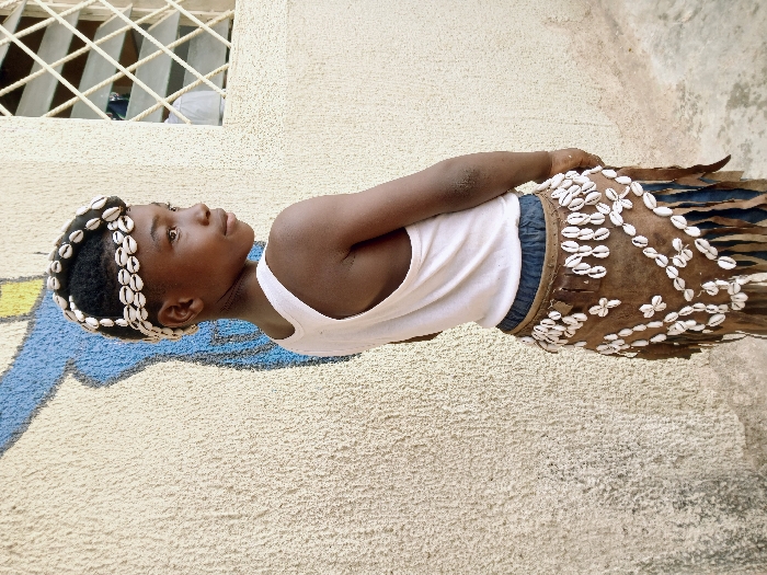 A young, dark-skinned male child is depicted standing outdoors, angled slightly away from the camera, with his head turned to the right side of the frame. He wears a white sleeveless tank top. On his head, he has a decorative headpiece composed of numerous white cowrie shells, forming a band across his forehead and along the sides. A brown, rough-textured skirt, possibly leather or hide, adorned with white cowrie shells in various patterns, covers his lower body, with a dark blue garment visible underneath at the waistline. The child's left arm is slightly bent, visible by his side. The background consists of a textured, light beige wall. A partial blue and yellow mural is visible on the wall to the left of the child, and a window with a white diagonal lattice grate is visible to his right. The specific location within the city of Masvingo, Zimbabwe, is not discernible from the provided image.