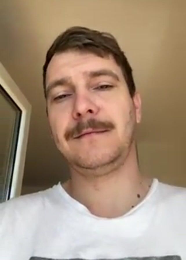A man with brown hair and a mustache, wearing a white t-shirt, stands in front of a sliding glass door with white blinds