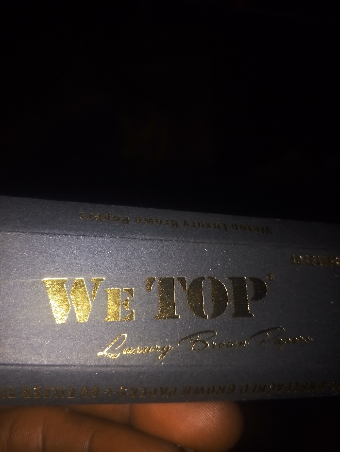 The image displays a close-up view of a dark gray rectangular package of rolling papers held by a human hand. The package features prominent gold foil lettering, with "WE TOP" in large uppercase letters, and "Luxury Brown Papers" in smaller cursive script below. Partially visible text near the bottom edge reads "UNBLEACHED BROWN PAPERS + 50 FILTER TIPS," while inverted text along the top edge states "WETOP Luxury Brown Papers." The hand, displaying fingers with a darker skin tone, grips the lower portion of the package. The background is uniformly dark and indistinct, offering no discernible environmental features. The location is in the city of Unknown, Unknown.
