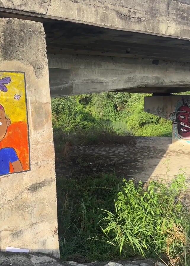 underside of a concrete bridge. There is colorful graffiti art on the concrete supports of the bridge. The art includes a portrait of a person on one support, and a depiction of spray paint cans on another. A small river flows under the bridge, and overgrown vegetation surrounds the concrete supports. The shadow of a person is visible in the foreground. The sky is blue in the background. The camera pans from one bridge support to the next.