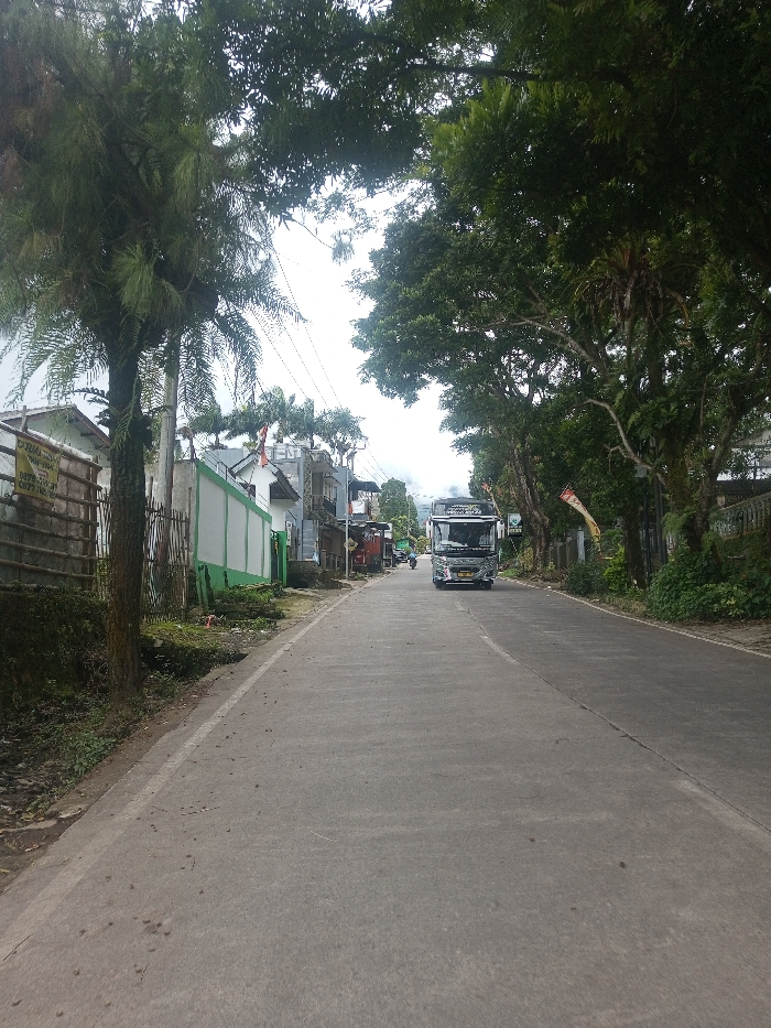 The image depicts a street scene in the city of Sarwahi Mal., India, under an overcast sky. A paved, two-lane road extends into the distance, with a faint white solid line marking its left edge and a partial, worn white dashed line indicating the center. A large, dark grey and silver-toned bus, with visible dark tinted windows and a decorative roofline, is positioned in the right lane, facing the viewer and appearing to move forward. Farther down the road, behind the bus, a single individual is observed riding a dark-colored scooter or motorcycle, also proceeding away from the viewer. Dense green foliage from numerous trees forms a canopy over much of the roadway, with significant growth on both sides. On the left, a tall conifer-like tree and several palm trees are prominent. Behind these, a wooden fence partially obscures residential structures, including a white building with a green lower section and a smaller, multi-story building. Red and white flag-like banners are affixed to poles or structures on both sides of the street, particularly visible near the buildings on the left and interspersed with the trees on the right. Utility poles and overhead wires are present along the left side of the road. On the right side, the road is bordered by a raised embankment covered in dense undergrowth and mature trees. The ground immediately adjacent to the road on the left is unpaved soil with sparse vegetation.