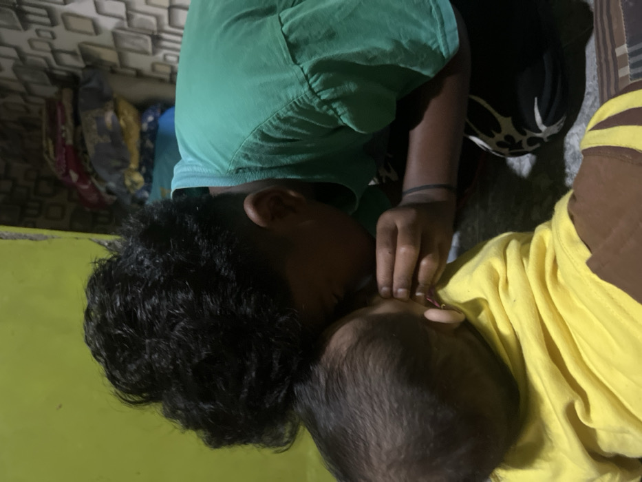 An indoor scene in Wedarijaksa, Indonesia, depicts two individuals. A primary subject, an older child or teenager with dark, curly hair, dark skin, and wearing a green t-shirt with dark pants, is observed kneeling. A black band is present on their left wrist. This individual leans forward, placing their face in close proximity to the left side of a second subject, an infant. The infant, wearing a yellow long-sleeved shirt and brown pants, has dark, straight hair and a visible pink earring in their left ear. The older individual's right hand is gently positioned on the infant's left ear. The background features a solid lime-green wall to the left and a light-colored wall with a repeating geometric wallpaper pattern to the right. Stacked textiles of various colors are visible on a surface against the patterned wall. The subjects are situated on a light-colored floor exhibiting a subtle striped pattern.