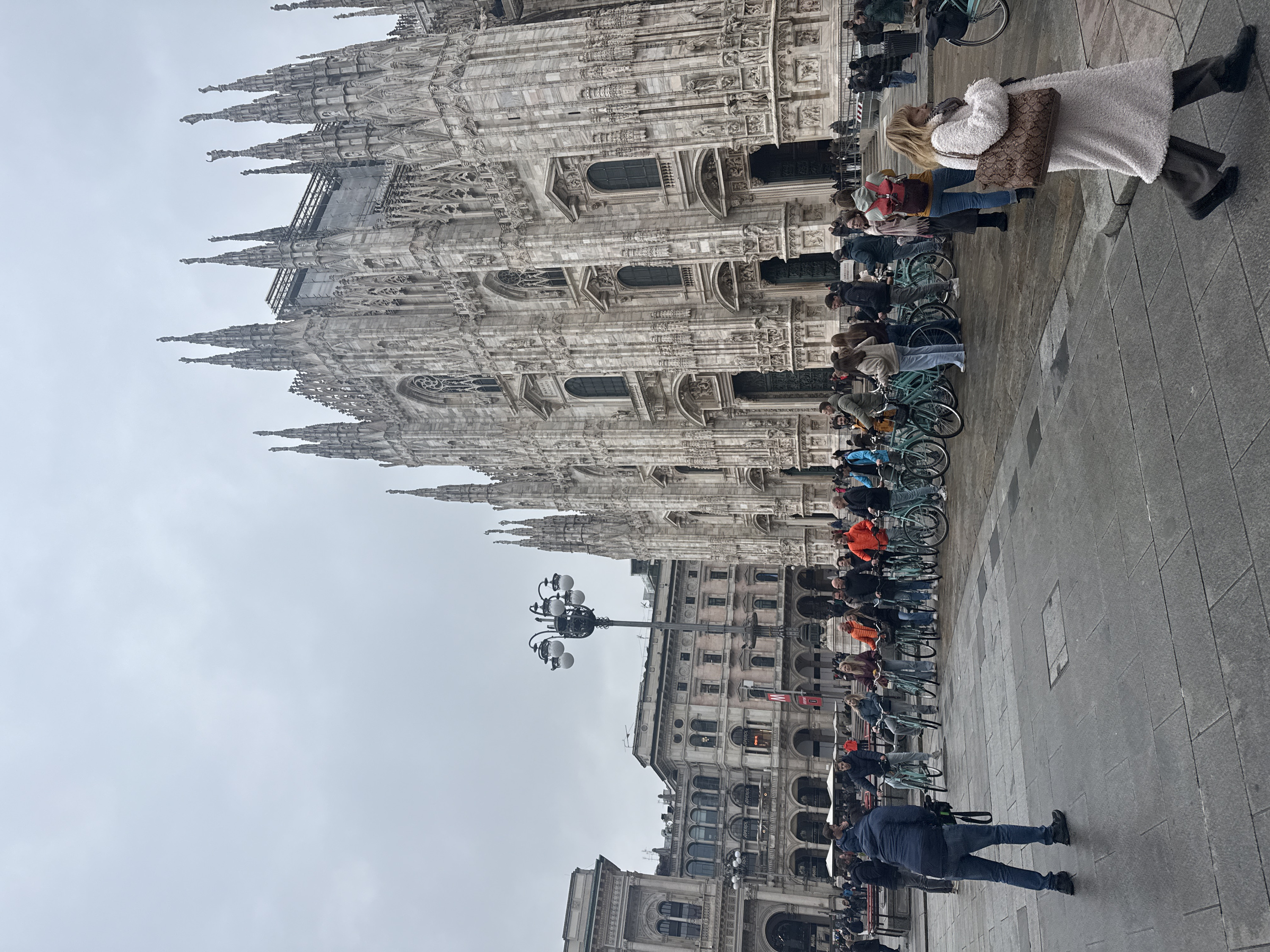 The image captures Piazza del Duomo in Milan, Italy, under an overcast sky