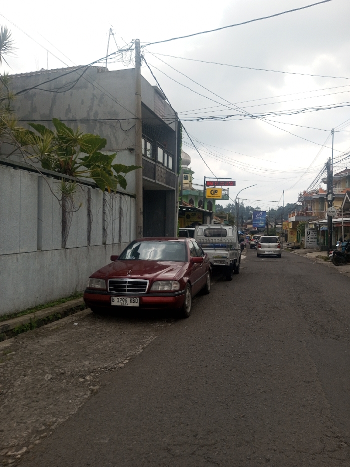 The scene is an urban street in Kalchini, India, under an overcast sky. A reddish-brown Mercedes-Benz sedan (W202 C-Class), bearing an Indonesian license plate 'B 3296 KBQ' with '12-23' below, is parked on the left side of a patched asphalt road. The vehicle is positioned next to a grey concrete wall adorned with green and yellow-striped foliage and trailing vines. Behind the Mercedes, a white pickup truck is partially visible, also parked street-side. Further down the street on the left, a multi-story building with a grey facade is visible, followed by a structure featuring a green dome and minaret (a mosque). A yellow 'CP' sign with red text is mounted on a pole in this area. The road, showing signs of wear, extends into the distance with a silver minivan and other vehicles visible moving away from the viewer. The right side of the street is lined with multi-story buildings. Numerous utility poles with extensive, tangled overhead wiring are prominent throughout the scene. No individuals are clearly visible or identifiable. Distant hills are present on the horizon.
