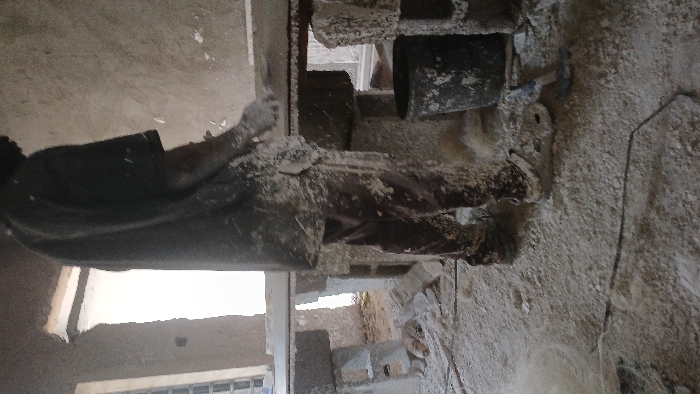 The image captures an indoor construction or workshop environment in Unknown, Nigeria. A single adult male is depicted from the right side, from mid-torso to feet, standing and actively working. He wears a dark short-sleeved shirt, dark trousers, and light-colored open-toed footwear, all extensively covered in a fine white particulate substance, consistent with plaster or cement dust. His hands, appearing gloved in white, are engaged with a white material on a makeshift work table constructed from concrete blocks and a flat surface. The environment features unfinished, rough-textured walls, with natural light entering from a visible window frame in the left background. The concrete floor, work surfaces, and objects are uniformly coated in the white particulate matter. A dark, dust-covered bucket sits on the floor near the worker's right leg, alongside a small, light-colored tool. A dark cable or hose lies on the dusty floor in the foreground. The scene indicates ongoing plastering or molding work.