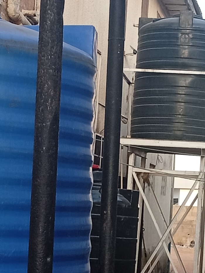 A blue corrugated water tank is on the left. In the center are two black pipes or posts. To the right is a dark green or black ribbed water tank elevated on a white metal frame. Behind the tanks and framing, a white building is visible. Steps and other structures are partially obscured between the blue and green tanks. The sky is visible at the top right.