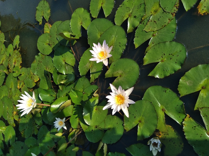The image displays a serene aquatic environment located in Cimacan, Indonesia. The scene is dominated by multiple white water lily blossoms (Nymphaea) and their associated green, rounded lily pads, which float on a calm, dark body of water. Approximately five prominent white water lily flowers, each with a distinct yellow center, are visible in various stages of bloom, alongside several smaller buds. The lily pads vary in size and some exhibit minor dark blemishes. Strong natural sunlight illuminates the scene from the upper left, casting defined shadows of the leaves and flowers onto the water and other foliage, indicating a clear, daytime outdoor setting. No human subjects or artificial structures are present.